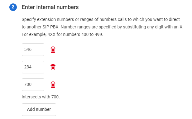 - Internal numbers. Specify the internal numbers of the connected PBX or their ranges so that the cloud PBX knows which calls should be sent to the connected system. You can add as many numbers and ranges as possible.