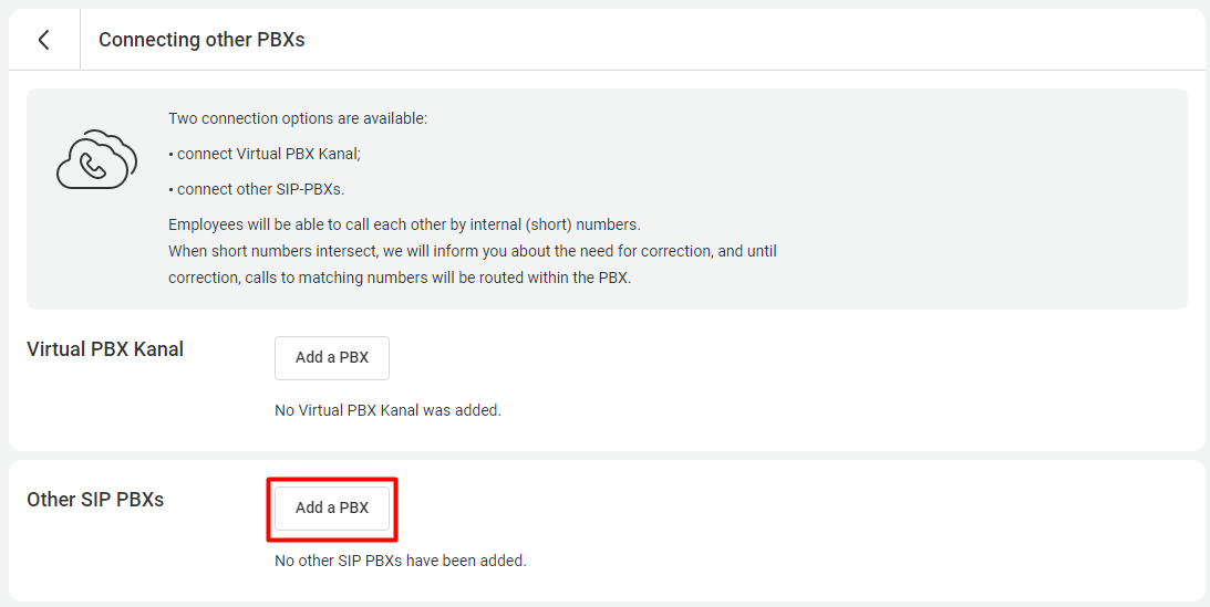 If you ignore this warning, calls to such numbers will be directed to the internal subscriber of the cloud PBX instead of the SIP PBX. To enable the ability to call all employees of the connected SIP PBX, you need to resolve the overlap in extension numbers.