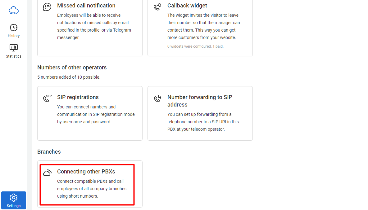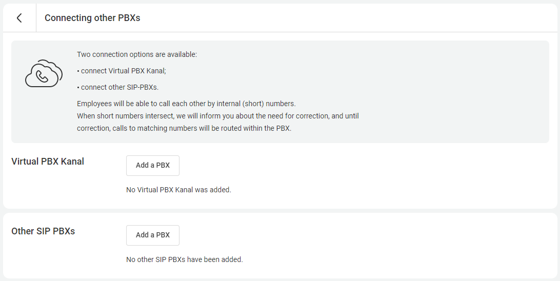 If your company has multiple branches that use separate cloud PBX systems with their own employees, departments, and independent statistics, you can connect them all into a unified telephone network with a single numbering plan.