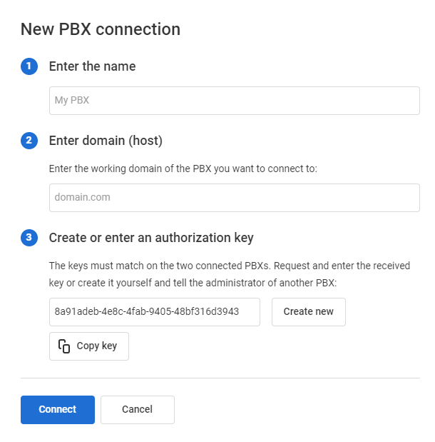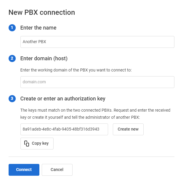 4. Go to the cloud PBX you want to add. Add the data of your first cloud PBX in the same way. Enter the authorization key that you created earlier for the first PBX.