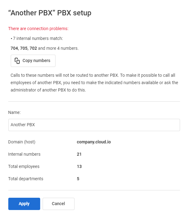 If both PBXs were initially created independently, there is a possibility of overlapping internal numbers. This will not hinder the connection of PBXs, but employees with overlapping numbers will not be reachable from the other PBX. During the connection process, the following warning message will appear: