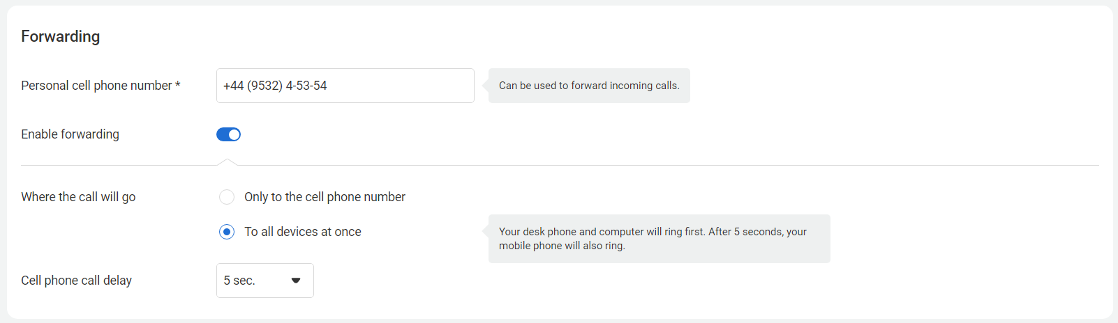 Provide an employee phone number and enable call forwarding (instant or delayed) if necessary. You can specify both a mobile number and a landline number here.