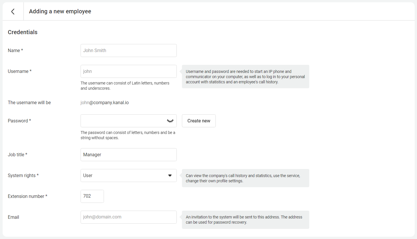 - Password. Create or autogenerate a password for the employee account. Besides, it's essential for configuring a SIP phone or a softphone.