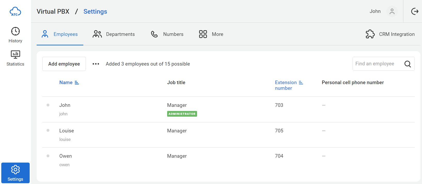 When you log into your cloud PBX account for the first time, you'll be taken to the Employees tab in the Settings section. This is where you can add new employees who will operate the telephony system.