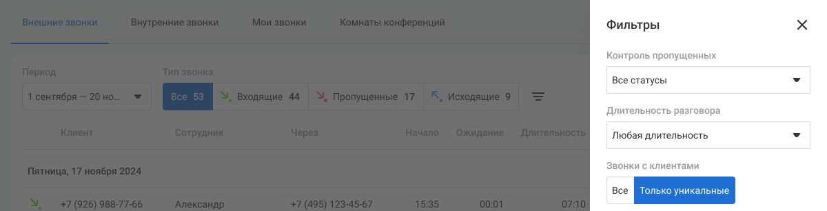 Воспользуйтесь фильтром по уникальным звонкам — он считает клиентов. Например, если клиент А позвонит в компанию 3 раза, а клиент Б — 4 раза, то всего будет 7 вызовов, из которых уникальных только 2.