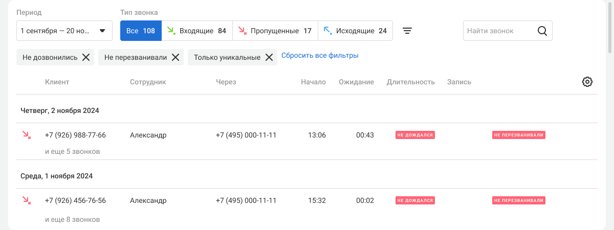 Фильтр «Контроль пропущенных» отображается в панели фильтров, когда выбраны типы звонков «Все», «Входящие» или «Пропущенные». При выборе типа звонков «Исходящие» фильтр «Контроль пропущенных» недоступен.Благодаря фильтру «Контроль пропущенных» вы сможете легко найти непринятые звонки, на которые сотрудники не перезванивали или не дозвонились.