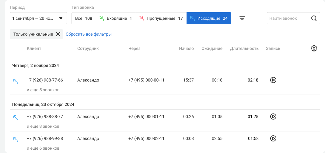 На вкладке «Исходящие» по количеству уникальных звонков вы поймете, сколько клиентов удалось обзвонить менеджерам.