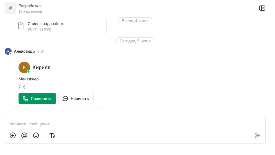 • Поделиться контактом в чате — в чате отобразится краткая карточка контакта с кнопками вызова и отправки сообщения (если это внутренний контакт).