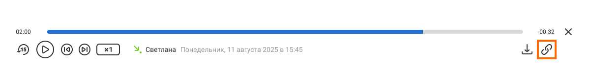 Чтобы поделиться записью звонка в чате, в проигрывателе нажмите на иконку ссылки в правом нижнем углу.