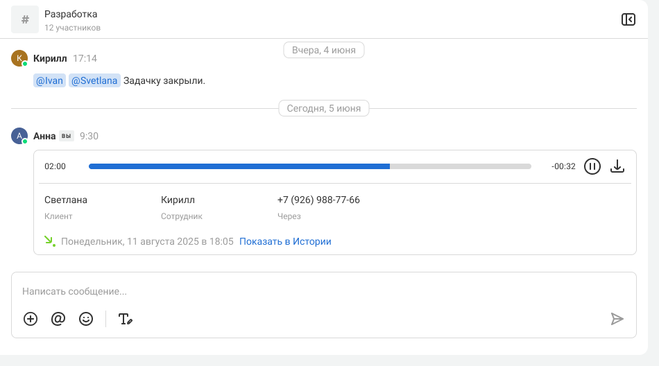 Отправленную запись можно прослушать и скачать прямо в чате.