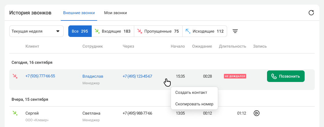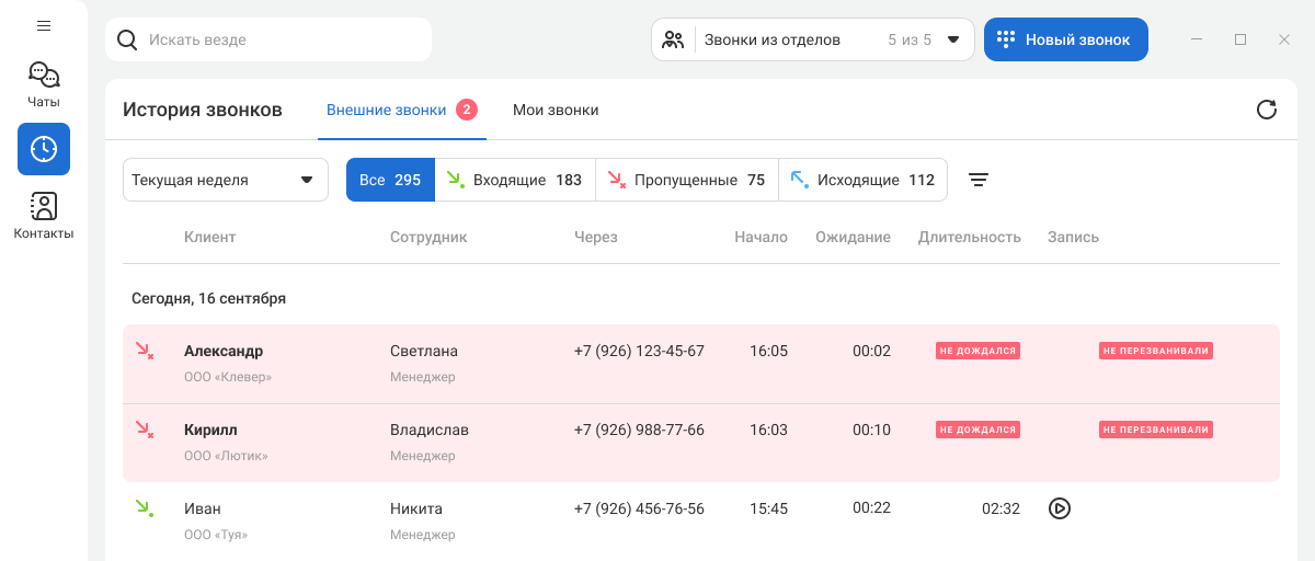При переходе в историю новый пропущенный звонок подсвечивается красным. Уведомление исчезает, если долго держать вкладку с новым пропущенным открытой или если кто-то из сотрудников перезвонит этому контакту.