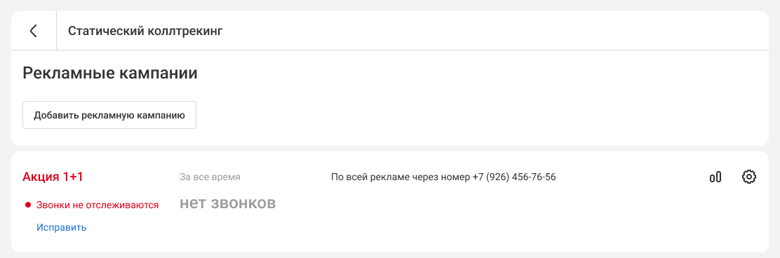 Если рекламная кампания настроена корректно, то в списке кампаний под ее названием отображается зеленый кружок. Если возник сбой в работе рекламной кампании, вы увидите красный кружок и соответствующий статус. Чтобы понять, что нужно сделать, чтобы звонки отслеживались, нажмите на «Исправить» под описанием проблемы.