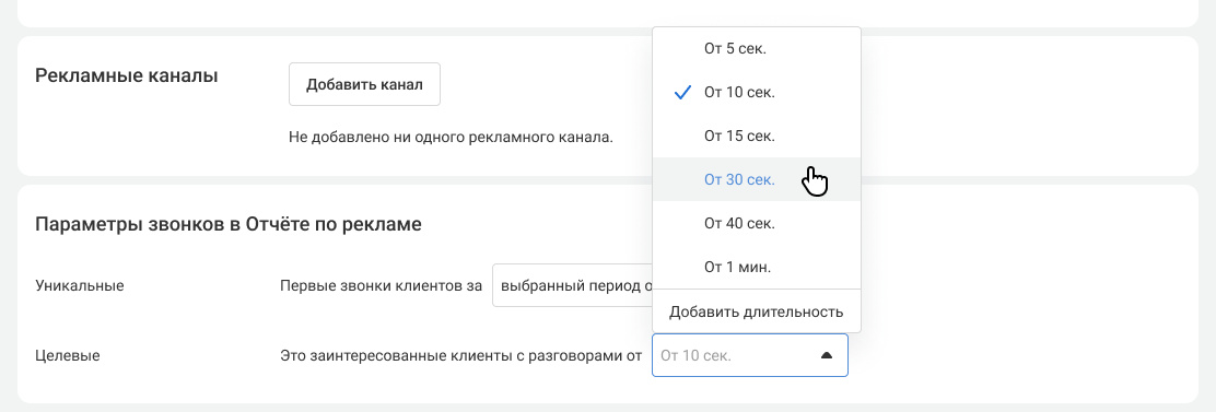 В блоке «Целевые звонки» выберите, звонки какой длительности стоит отслеживать в результатах рекламной кампании.