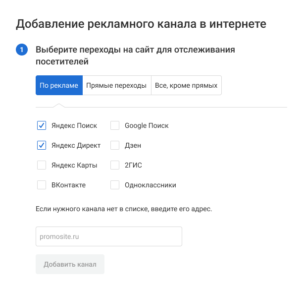 При выборе переходов по рекламе откроется список рекламных каналов. Выберите один или несколько каналов, переходы с которых хотите отслеживать с одного номера.