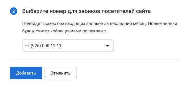 6. Выберите номер, звонки на который будут считаться переходами с выбранных рекламных каналов.