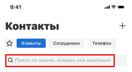 Чтобы найти контакт по имени, номеру телефона или названию компании, воспользуйтесь поисковой строкой вверху экрана.