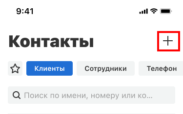 Чтобы добавить контакт, которого нет в истории, перейдите в раздел «Контакты» и нажмите на плюс в правом верхнем углу.